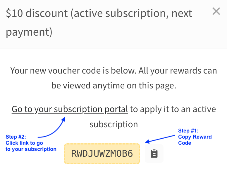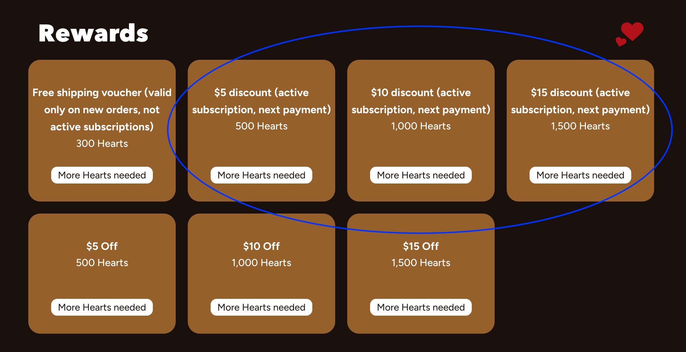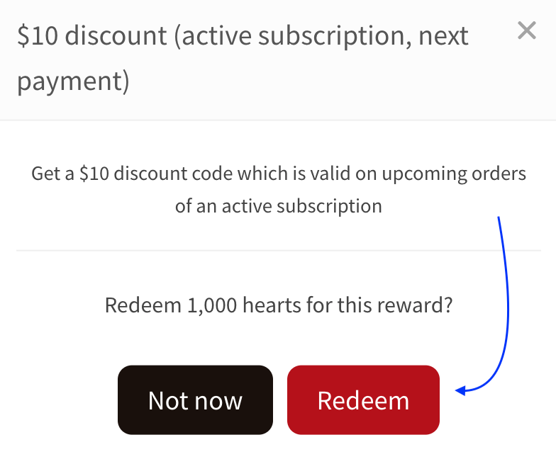 When redeeming your reward, be sure to select the subscription option if you want to apply it to an upcoming subscription shipment. These are the only rewards that can be applied to active subscriptions.